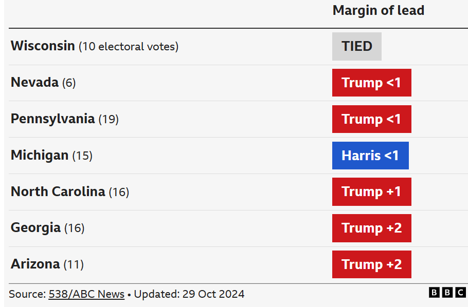 At the time of writing, Drift’s BET market predicts a 62% chance of a second Trump presidency. Polling in the swing states seems to back this up, however fine the margins are.